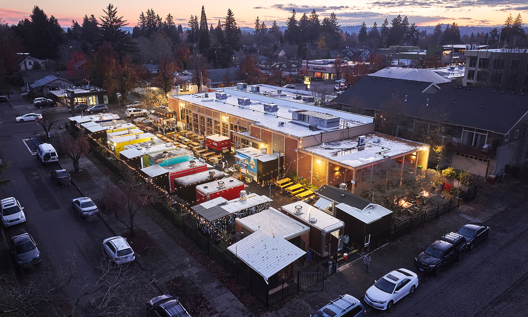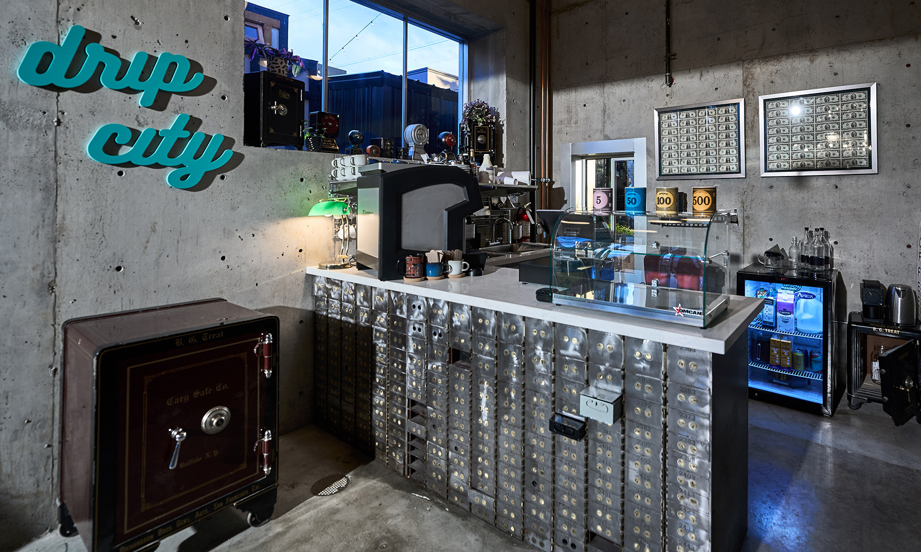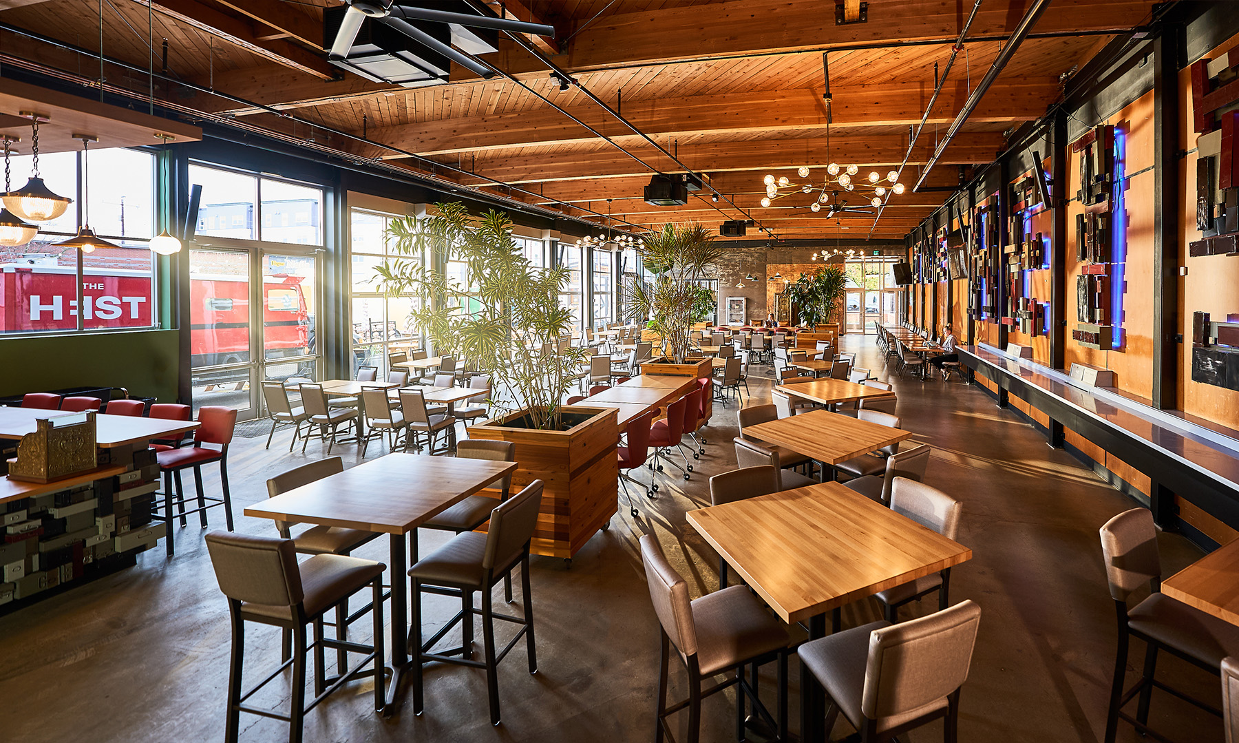 The Heist Food Hall project transformed a 1950s U.S. Bank building, most known for a real bank heist in 2010, into a dynamic and immersive food hall destination. The design celebrated the building’s unique history by creatively repurposing original bank elements such as the vault, ATM window, and deposit boxes into new program features, alongside custom metalwork, penny flooring, and thematic artwork. The phased project also included a structural seismic upgrade, new fire sprinkler and MEP systems, re-imagined interior layout with restaurants and entertainment spaces, and a large exterior food cart pod supporting 21 vendors, and was completed between May 2023 and November 2024.